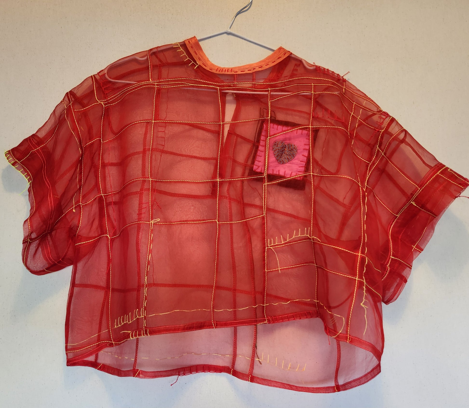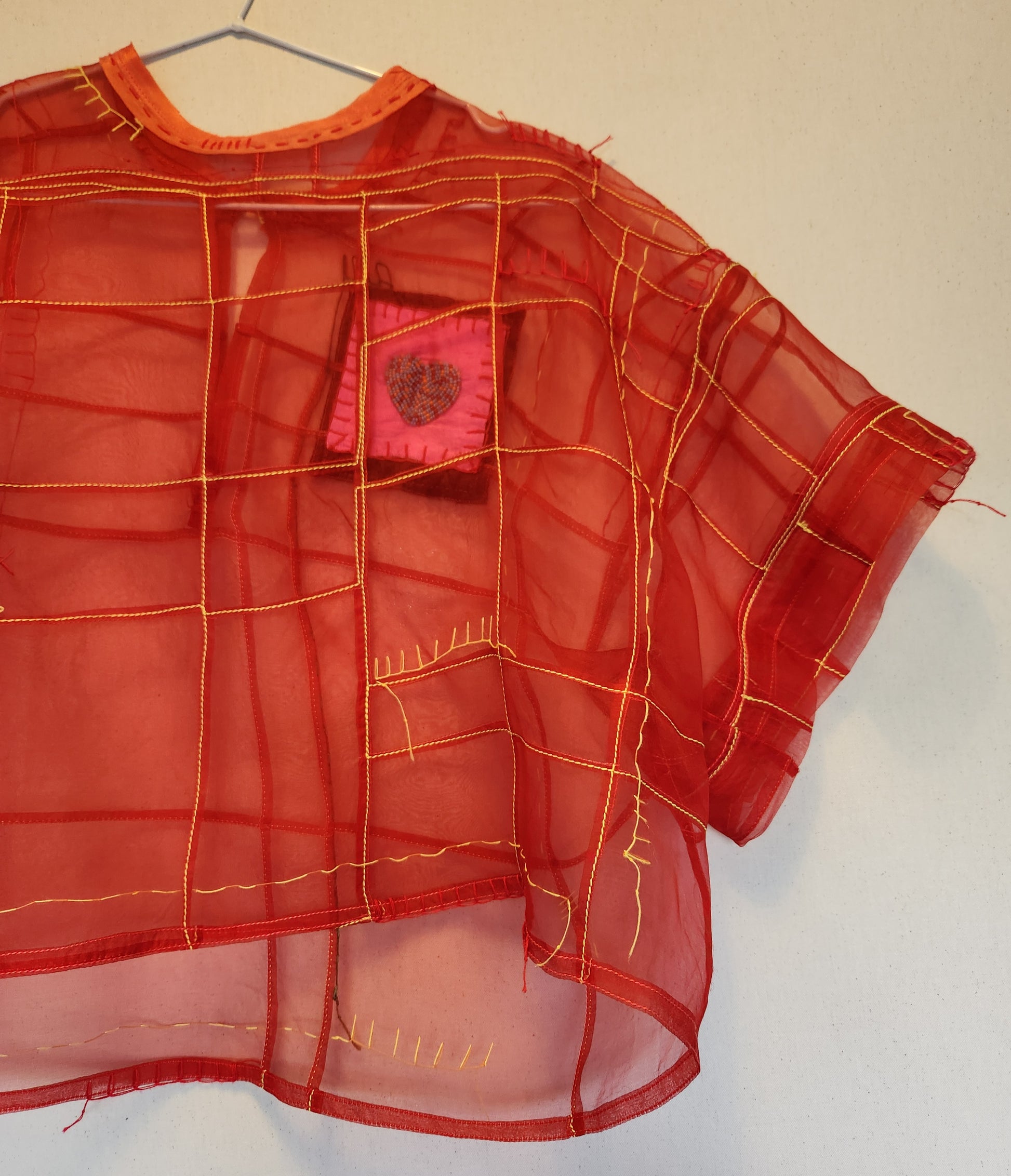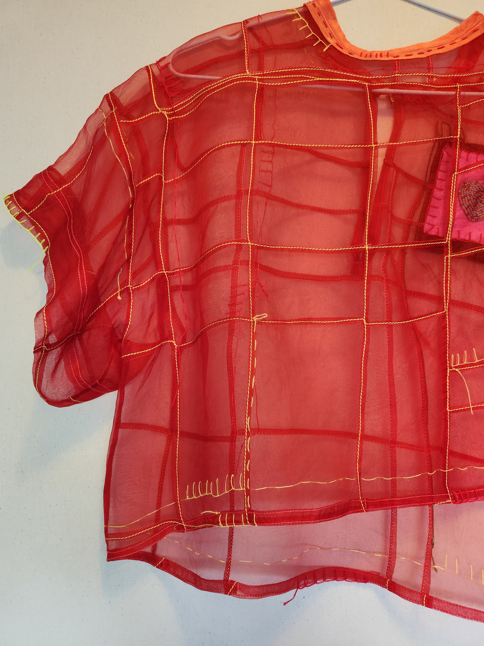 Hand dyed and patched off-cuts, silk organza t-shirt, with hand embroidery. Button closure at the back neck. Once off piece.