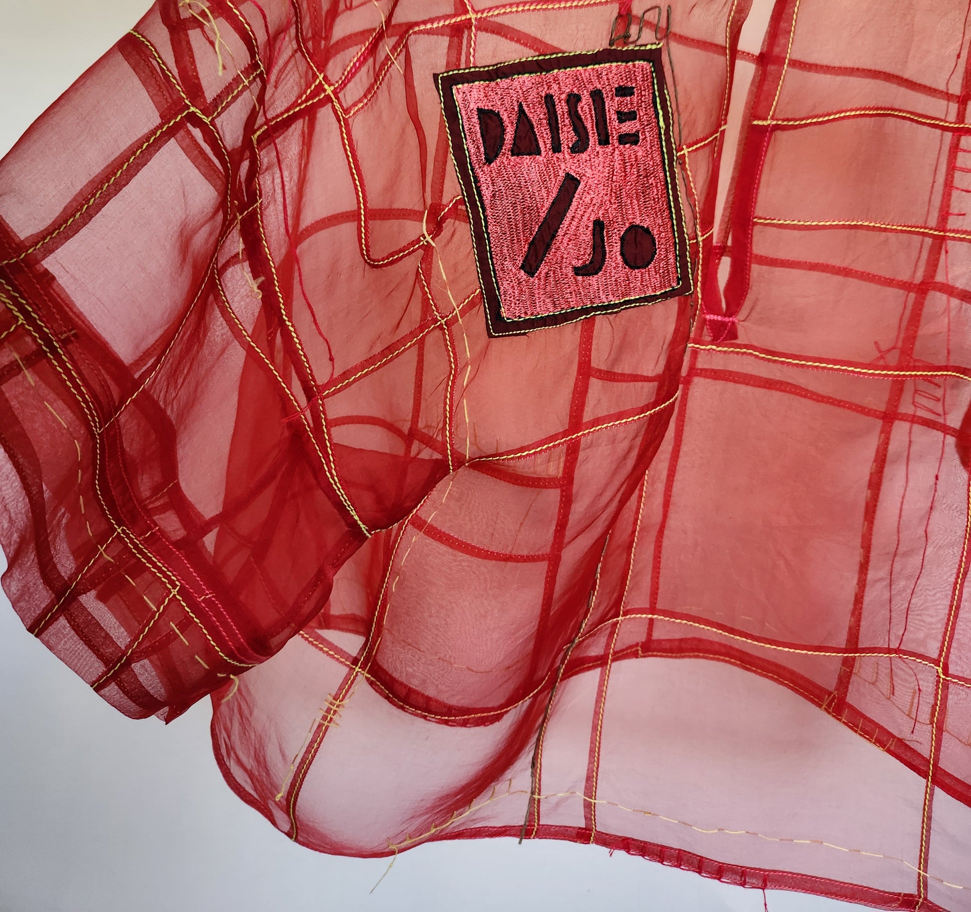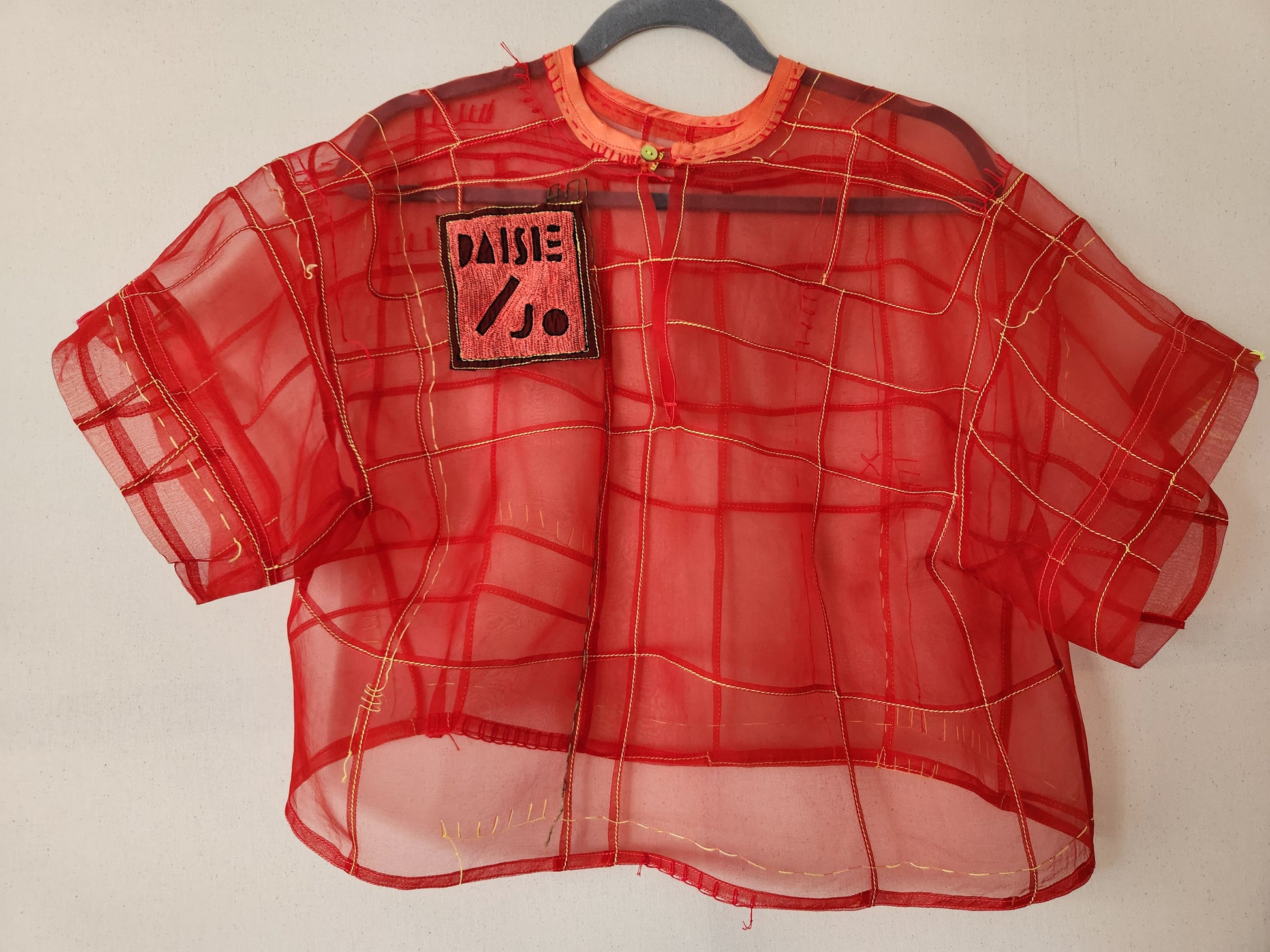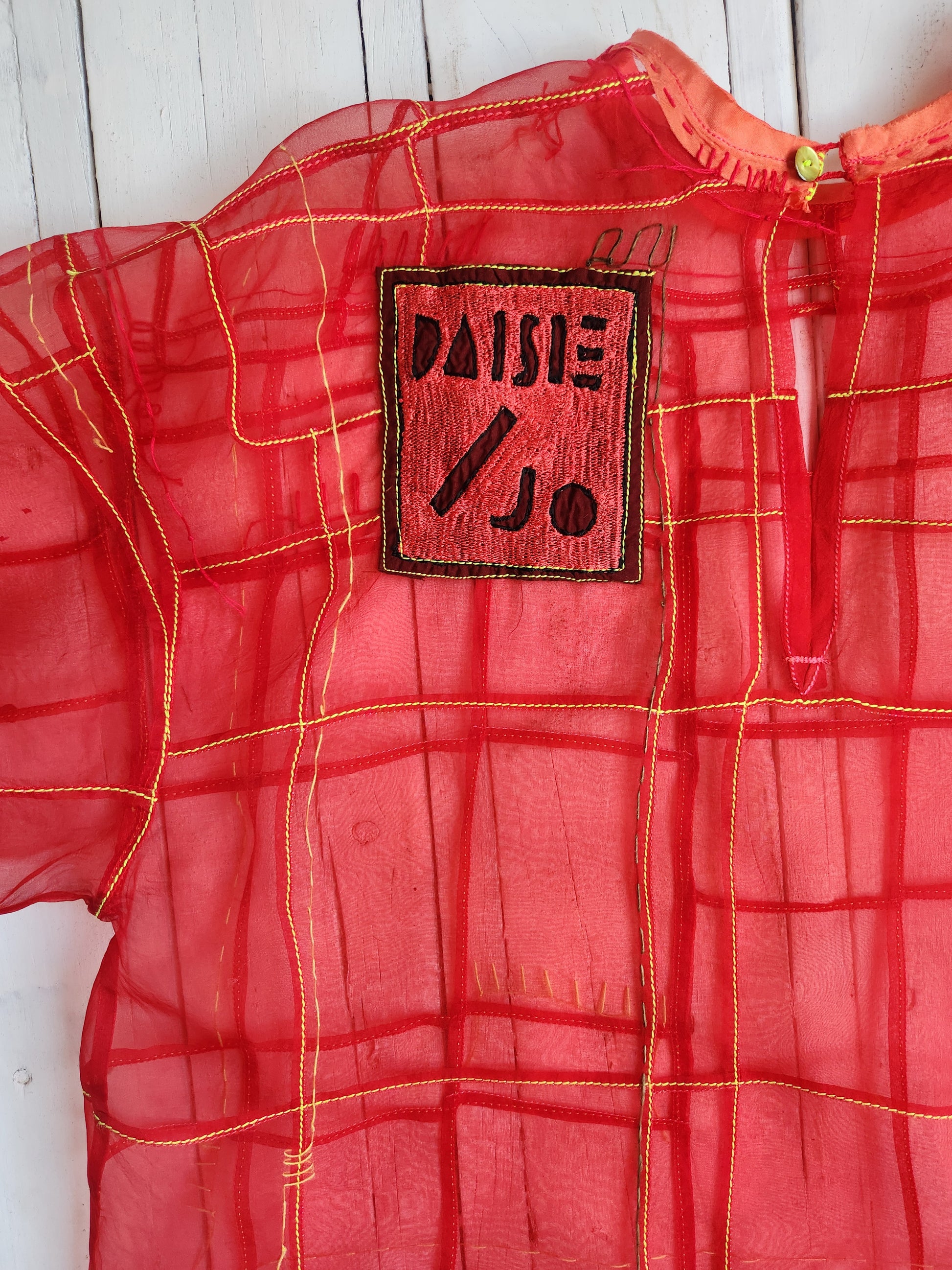 Hand dyed and patched off-cuts, silk organza t-shirt, with hand embroidery. Button closure at the back neck. Once off piece.